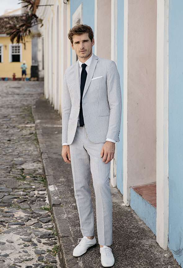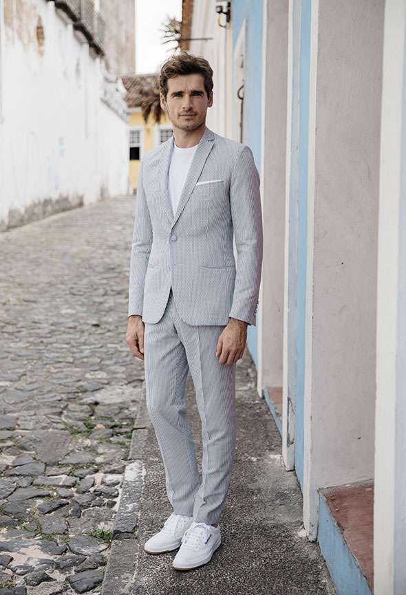 Blanche, c’est la mer, le soleil, la légèreté des soirées d’été. C’est une pièce iconique, incontournable du vestiaire masculin. Un seersucker gaufré qui porte en lui même une singularité à travers une ligne bleue irrégulière. Nous l’avons travaillé dans 2 versions au niveau du pantalon : un pantalon à cordon (à porter avec un t shirt blanc et des baskets) et un pantalon, plus basique, à ceinture classique.