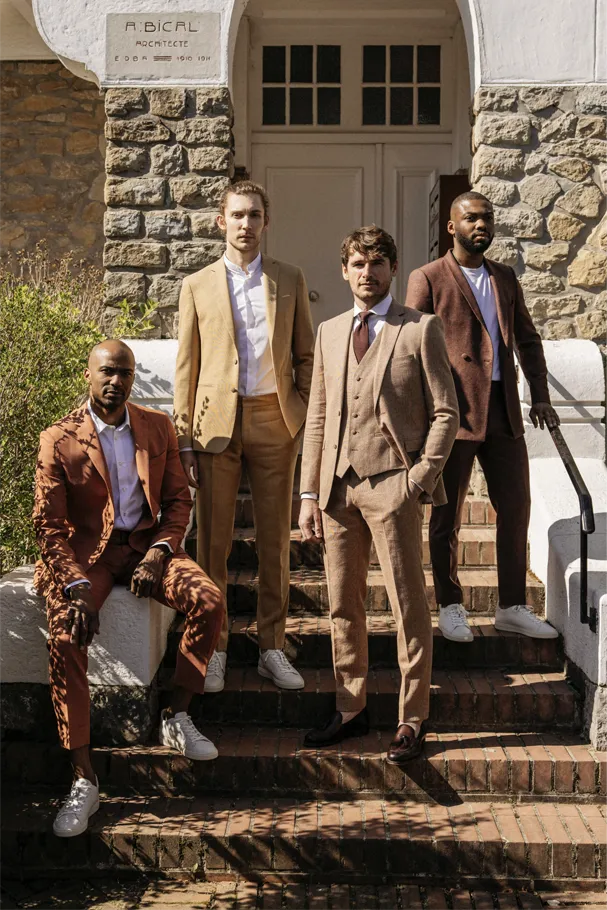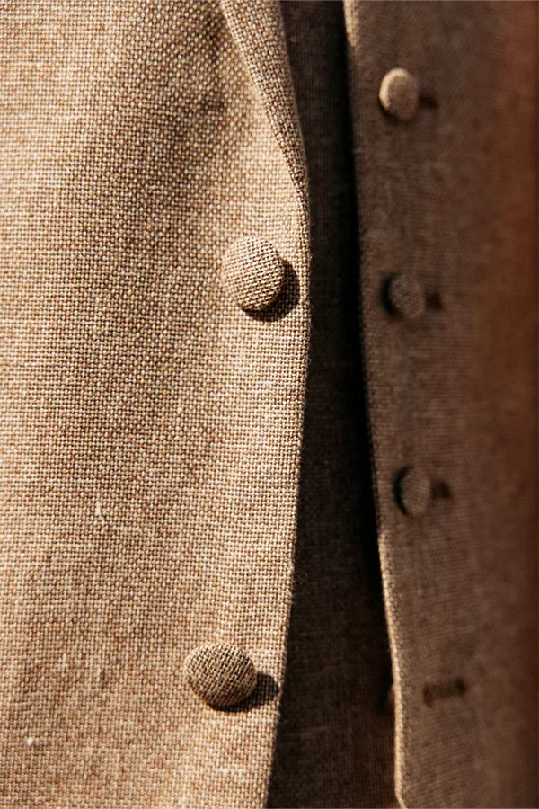 Un costume aux douces teintes pastels. Une étoffe en laine, lin et coton qui crée une texture au contraste des fils brun, rose et blanc. Parfait pour un mariage estival.