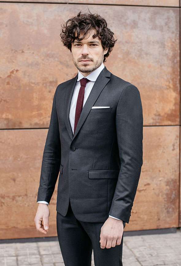 Tim, une veste sur mesure confectionnée à partir d’une toile 100 % Laine gris foncé. Subtil et élégant, cette veste classique est indémodable.