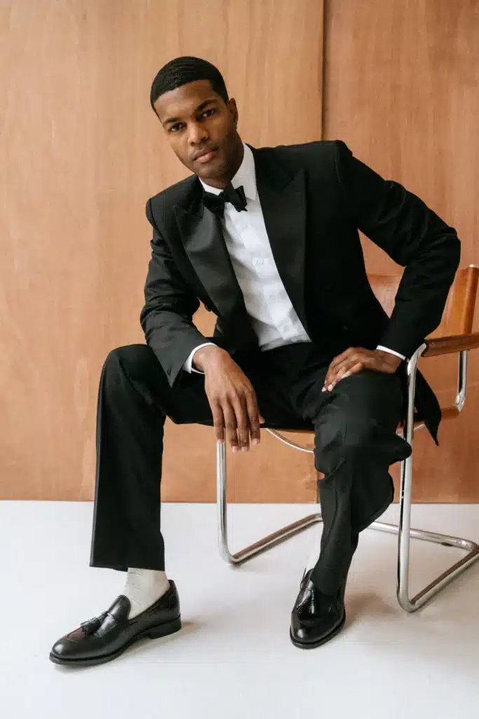 Souvent porté avec un nœud papillon souple ou un foulard en soie, le smoking incarne une personnalité confiante et expressive. Nous avons décidé de vous proposer deux tenues de soirée