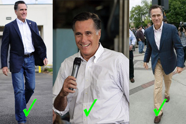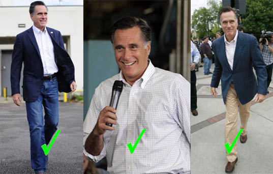 Sous ses airs de milliardaire proche du peuple, Mitt Romney ne s’en sort pas mal. Exit les accessoires trop « tape à l’œil » et les bijoux en or, il opte pour des costumes simples et sans cravate. Totalement dans la tendance, il ose dépareiller le haut avec le bas. La chemise est légèrement déboutonnée (un seul bouton ouvert uniquement), le pantalon camel avec une veste bleu navy et porte même l’imprimé carreau pour les représentations. Mitt Romney ose s’écarter des sentiers battus et ça lui va bien !