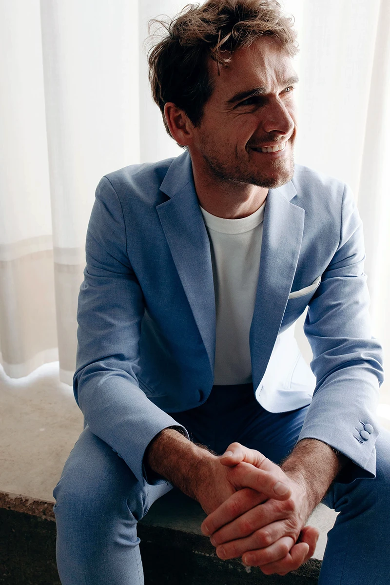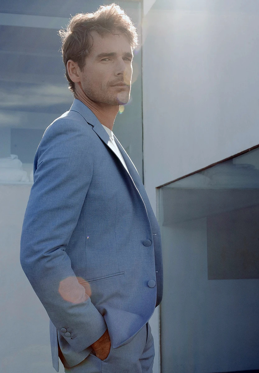 Bleu clair et lumineux ce costume est issu d’un mélange de laine, coton et soie. Une combinaison parfaite qui permet de s’évader dans un tissu unique et léger.