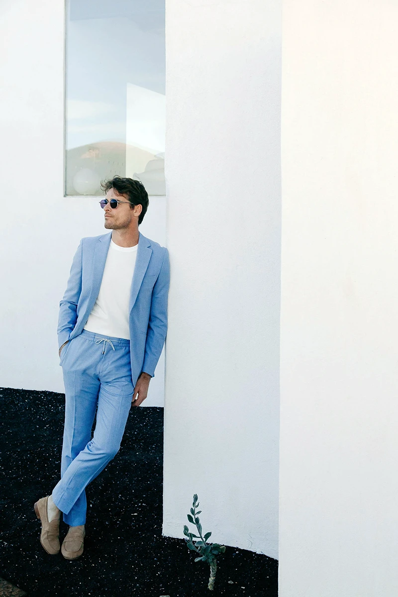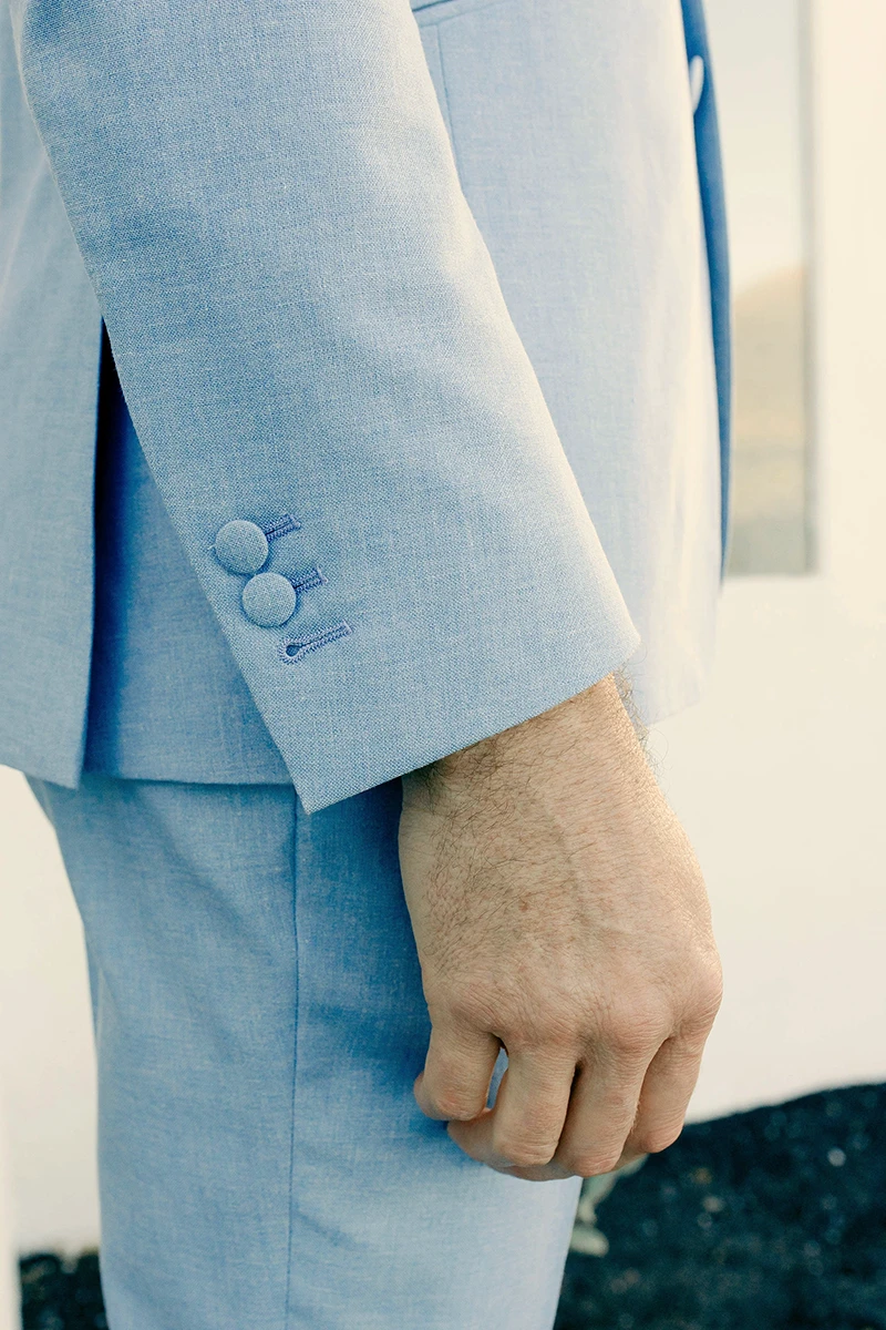 Un costume de mariage bleu ciel aux notes blanches lumineuses.
