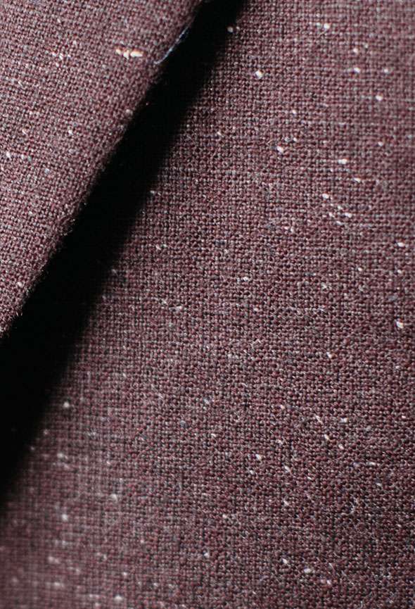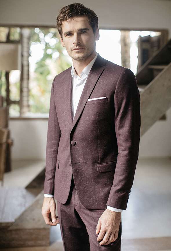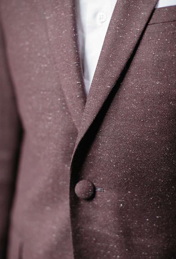 Chloé, c’est un costume sur mesure mariage, moucheté, au superbe tombé. Nous avons travaillé cette pièce dans un bordeaux ni clair, ni foncé afin qu’il puisse être porté en été. Cette étoffe est composée de trois fils blancs, gris et bordeaux.