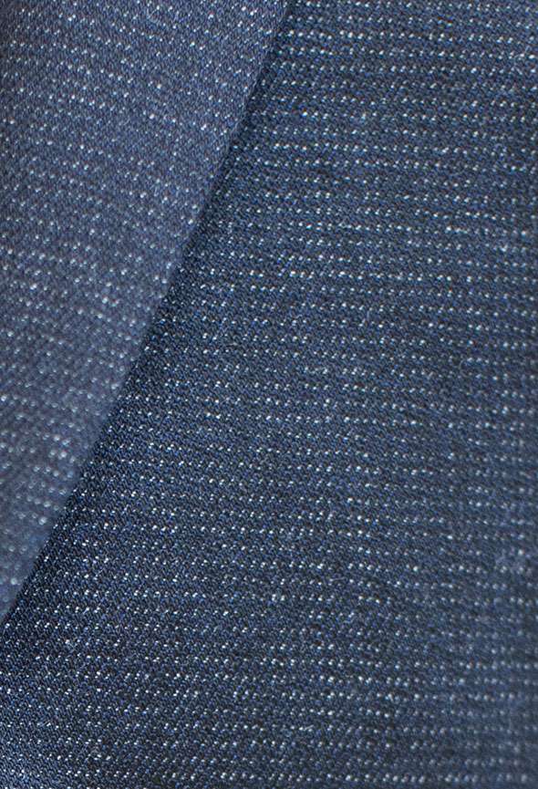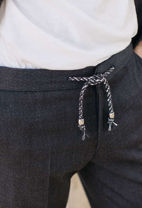 Ninon, c’est la sobriété d’une étoffe bleue nuit, presque noire, sur laquelle se dessine une légère trame grisée. Nous avons joué sur les codes du sportswear à travers un galon de pantalon en coton, une fermeture à cordon et une ceinture élastique. C’est une pièce à la fois élégante et nonchalante.