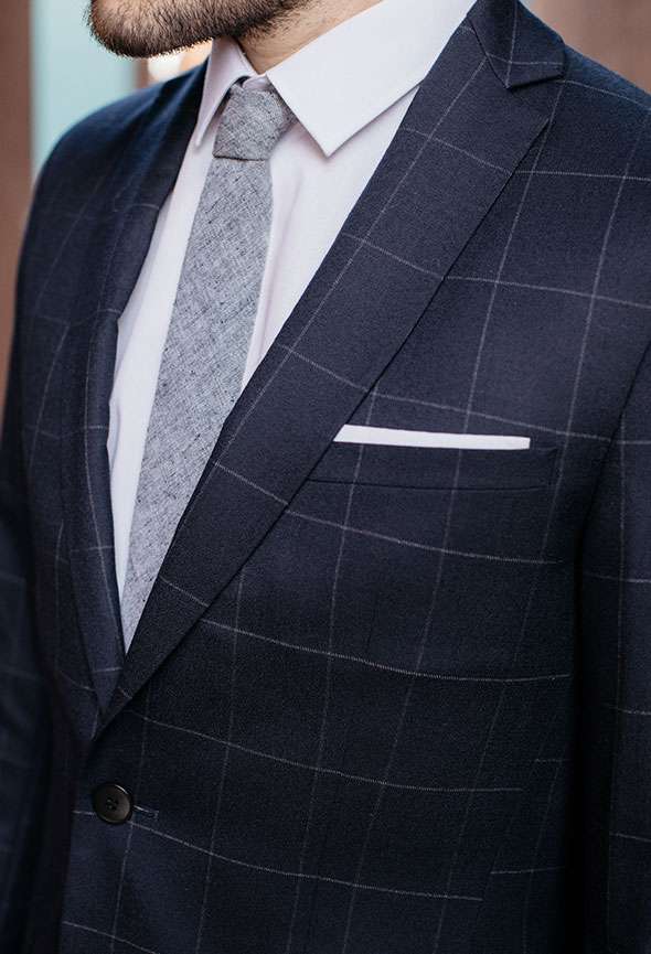 Costume sur mesure laine bleu marine à carreaux fenêtre