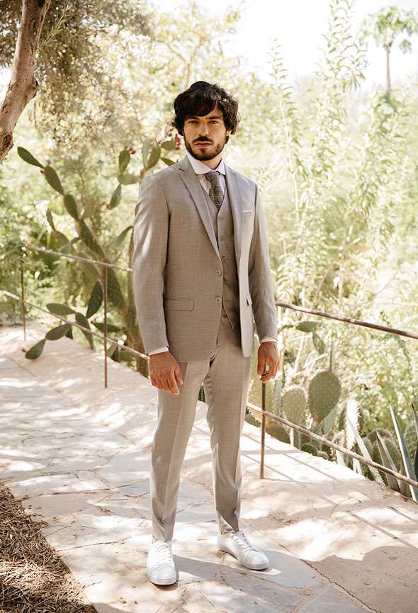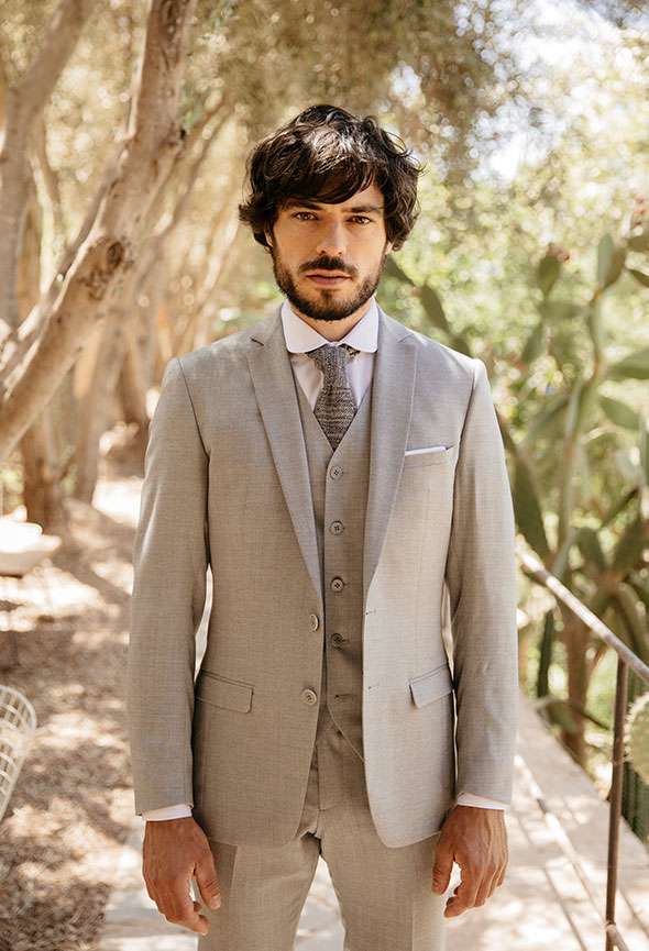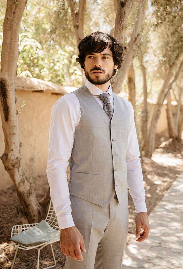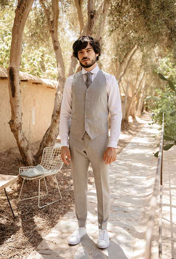 Aile, c’est un costume sur mesure à la teinte grise claire et une texture en gros grain. Cette silhouette est idéale pour le brunch du lendemain.