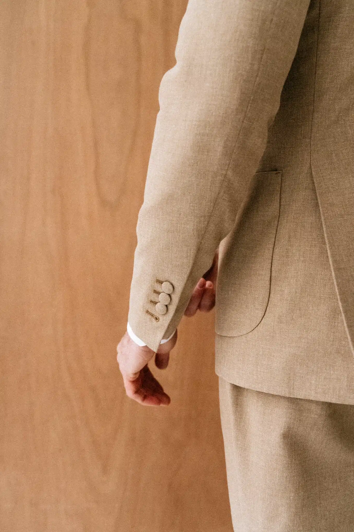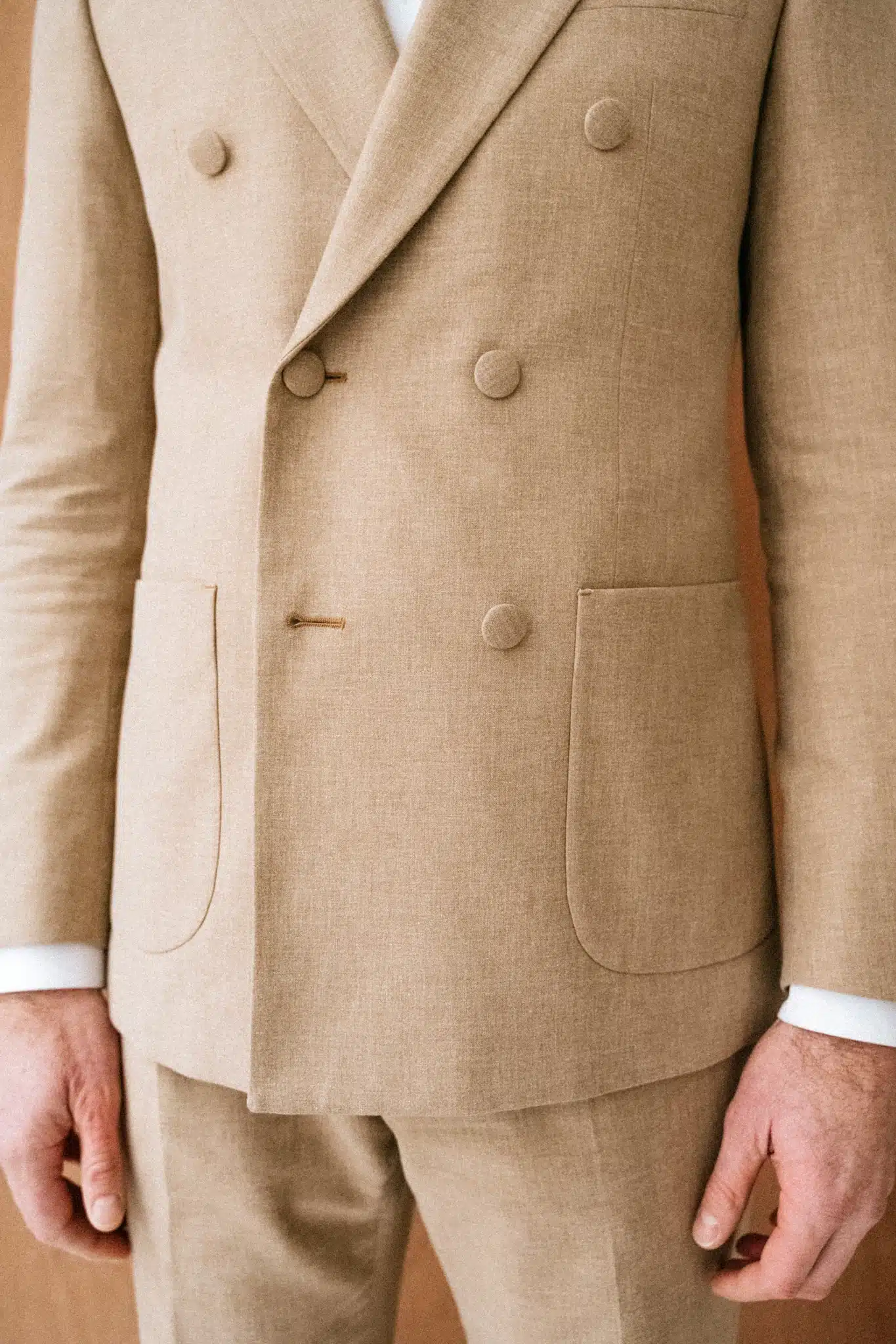 Le chiné du tissu lui apporte une texture loin des couleur lisses du costume beige classique.