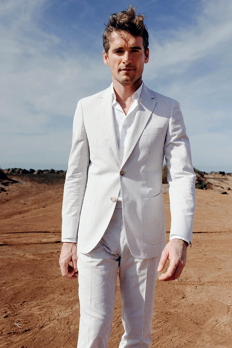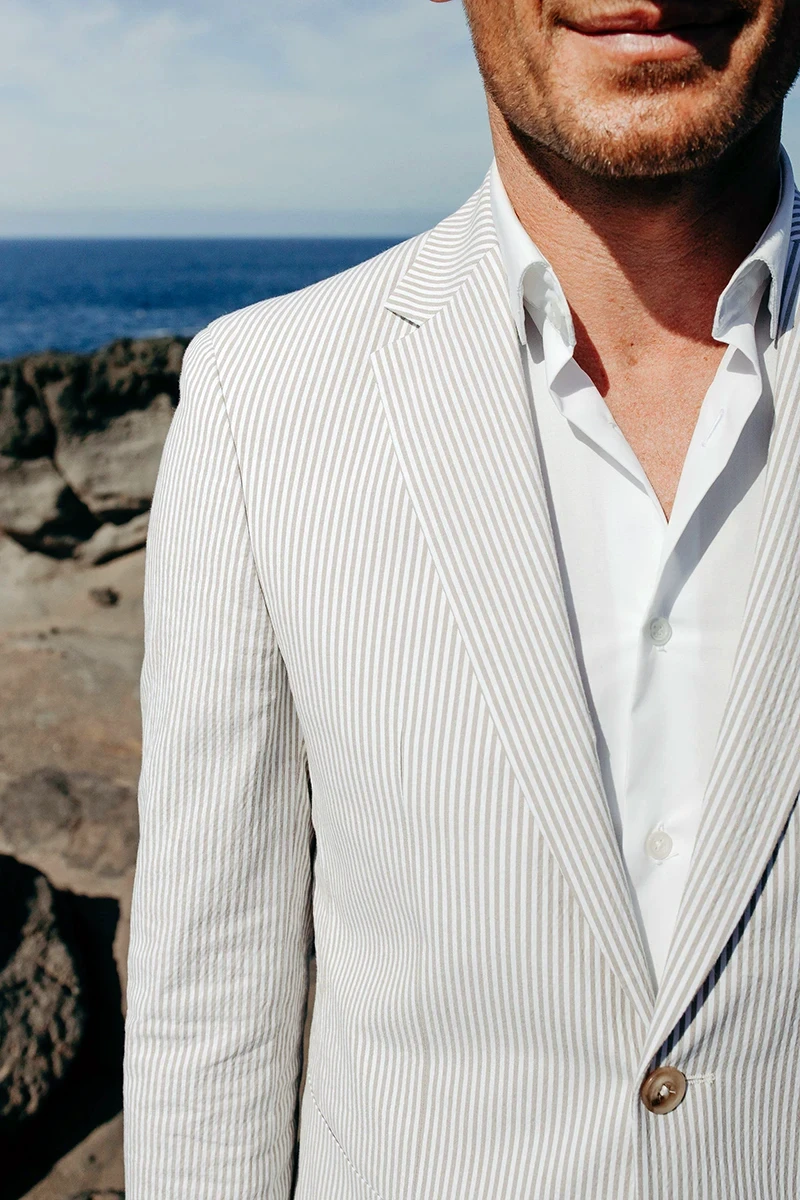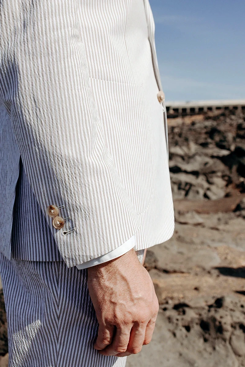 Un costume sur mesure seersucker aux lignes blanches et beiges.