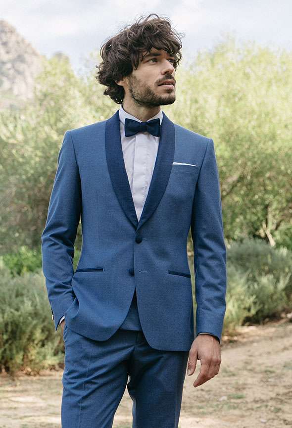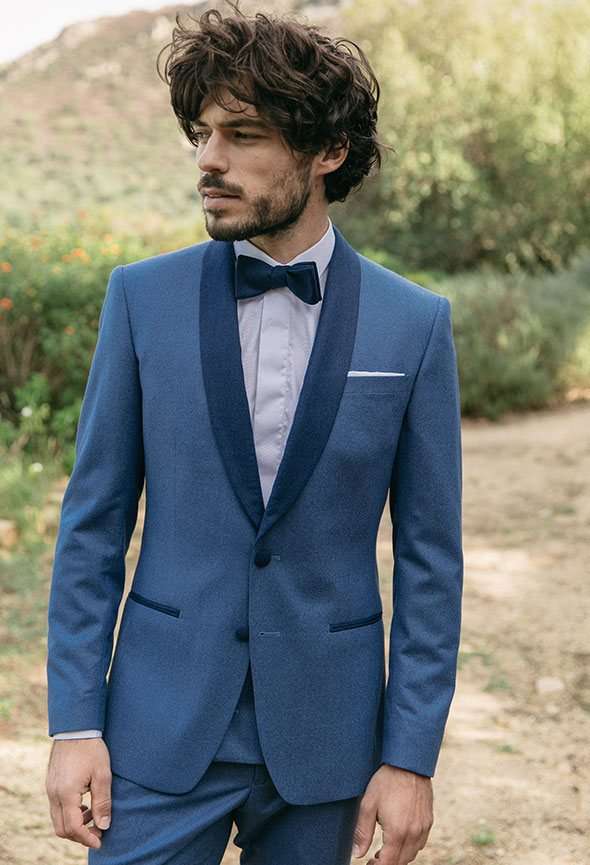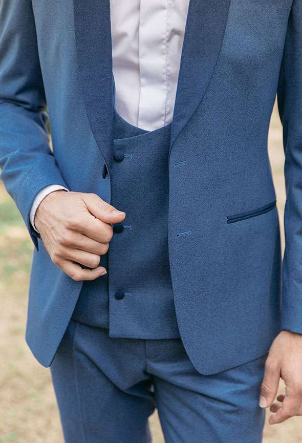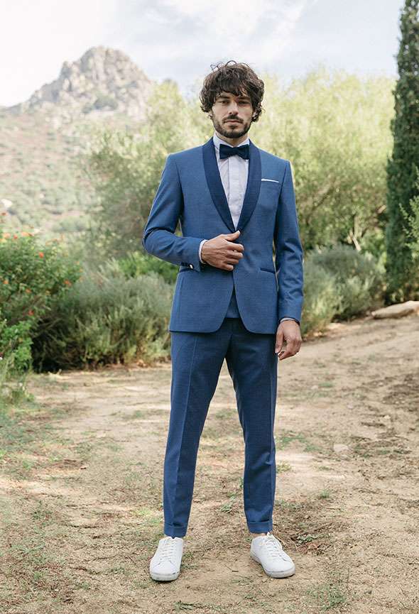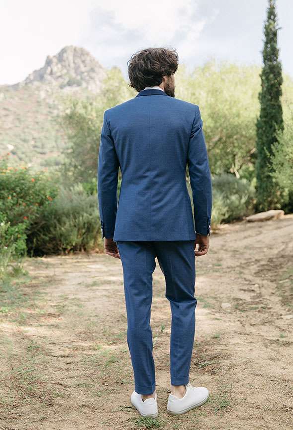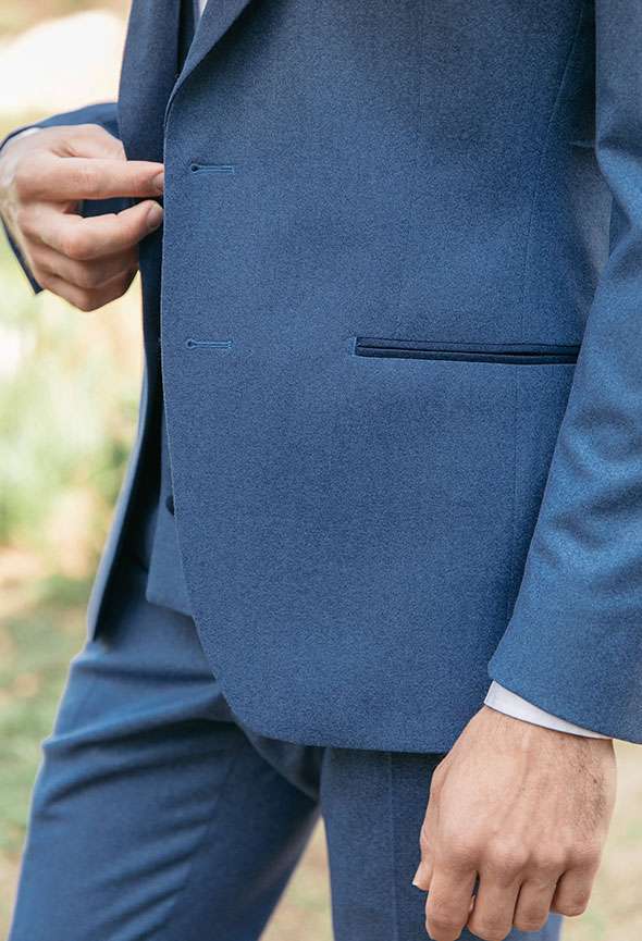 Vesper c’est la version corse du smoking bleu. Sa flanelle de Laine lui donne une texture singulière. Un incontournable pour un mariage chic.