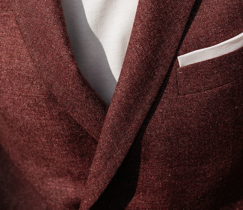 Sute, c’est un costume de mariage moucheté et affirmé au superbe tombé. Nous avons travaillé cette pièce dans un terra rossa feux. Un teinte ni trop claire, ni trop foncée, mais assez colorée pour qu’elle puisse être portée en été.
