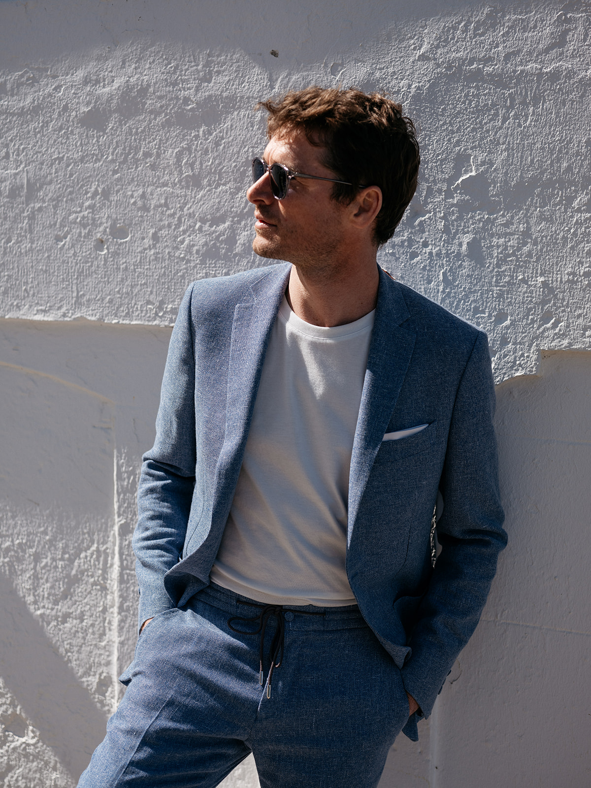 Idéal lors d’une belle journée d’été. Ce costume 2 pièces bleu ciel, doux, légèrement grisé, a été créé à partir de différentes matières. On apprécie son toucher, sa texture, le contraste des fils bleus, gris et blancs.